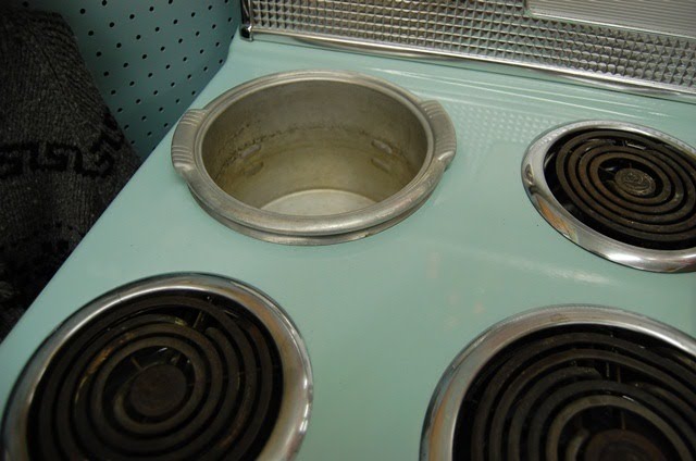 This stove has a built-in soup tureen! How cool is that?! Have you ever seen a stove with its own soup tureen? Looks like it was put to good use, too. Update: Several folks have left comments here and on Facebook saying this was also called a deep well cooker. Apparently, you could even fry in it. That was probably safer than frying up on top of the stove and less hot grease splatters, too.