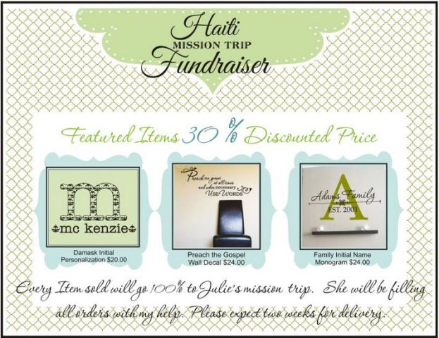 My Daughter, Julie is 16 and will be going on her first mission trip this summer to Haiti. We put our minds to work and came up with this idea to help her raise money for her trip. I am donating the supplies, and Julie is donating her time, to help raise money for her cause. Her goal is $1200.00 and will be giving weekly updates on Julie's blog to keep everyone posted about her progress.