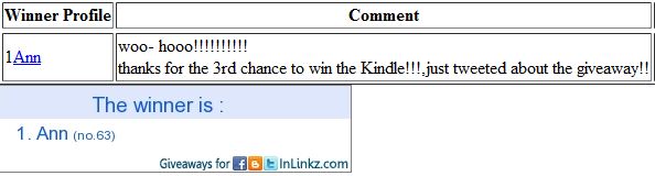 The Kindle Giveaway ended on Tuesday, so it's time to announce the winner. Thanks so much to everyone who entered the giveaway.