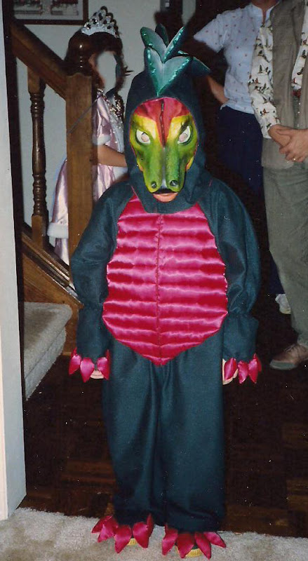 Chip wanted to be a dinosaur for Halloween that year, so I broke out the old Kenmore sewing machine again. It had been my sisters for many years before it was gifted to me and unfortunately, it had developed a very bad habit of breaking thread every 5 seconds. Even a trip to Sears for a "tune-up" didn't cure it. It took me about a month to make the dinosaur costume, sewing whenever I had a little free time .