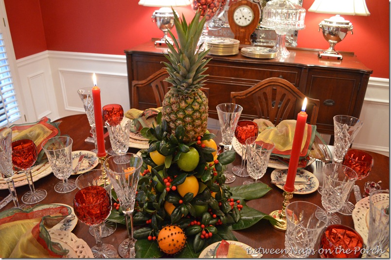 The limes are so big, they almost look like green apples, don’t they? The dining room is filled with the wonderful scent of oranges, cloves and lemons. Wish you were here to enjoy it with me. If you would like to make a Colonial Williamsburg style fruit tree some year for Christmas, you’ll find the tutorial HERE.